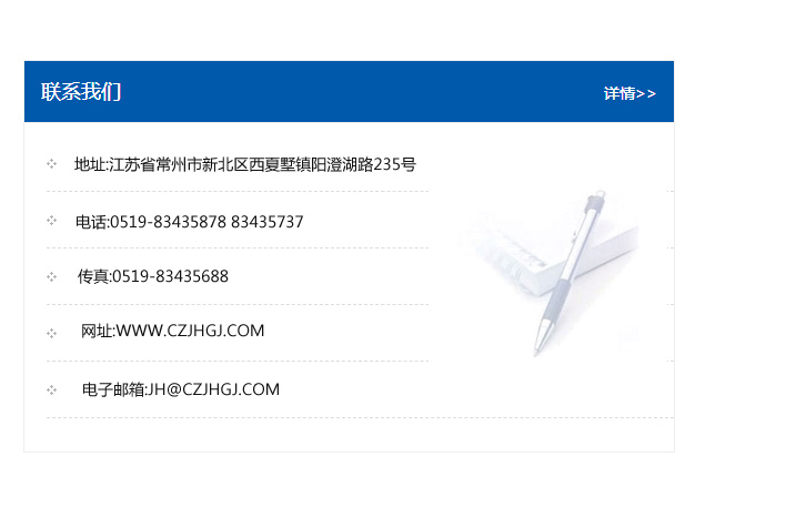 地址:常州市新北區(qū)友邦商務大廈1幢16、17層  電話:0519-85101652  傳真:0519-85112595  郵編:213022  網(wǎng)址:www.cz-jiayue_cn.nlffy.com  郵箱:xiajifengaa@163.com